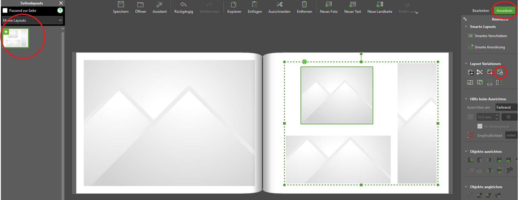 Markieren Sie einen oder mehrere Fotoplatzhalter auf der Seite, deren Seitenlayout Sie speichern möchten und klicken in den Werkzeugkasten "Anordnen" im Bereich "Layout Variationen" auf die Funktion "Layout speichern".