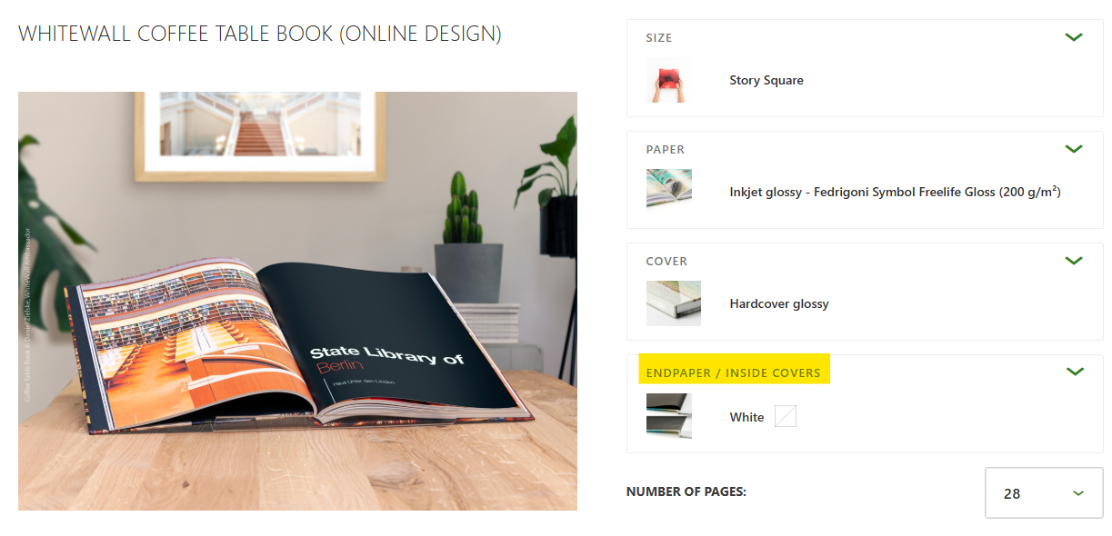 You can select the color of your Coffee Table Book's endpaper from 36 colors plus white during design. If no color is chosen, it defaults to white. Colored endpapers are available for photo and inkjet papers, with variations in processing and material. In the online editor, choose or change endpaper color via “Book options.” In the download software, select the endpaper color directly within the inside pages editor.