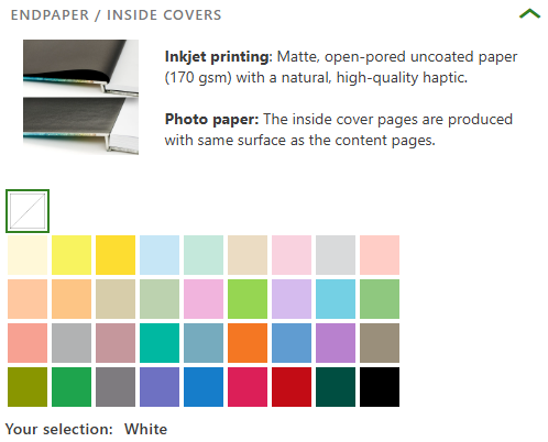 Colored endpapers are available for both photo papers and inkjet papers. Depending on the selected paper, the processing and material of the endpaper may vary.