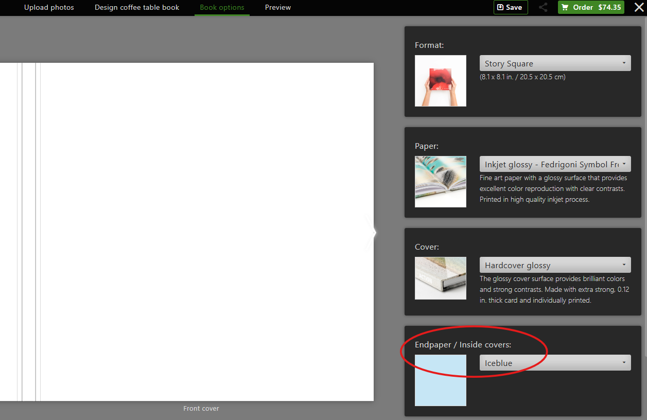 After clicking “Create now” and “Create online,” you can select the color of the endpaper before beginning your design: