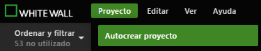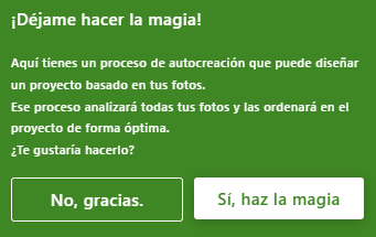 Encontrará el asistente después de subir sus fotos y antes de comenzar la creación en la esquina inferior derecha mediante la varita mágica verde, o más tarde durante la creación en la esquina superior izquierda del editor bajo « Proyecto ».