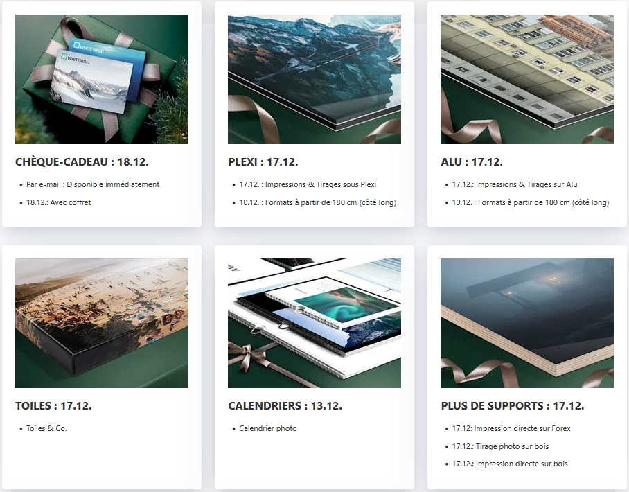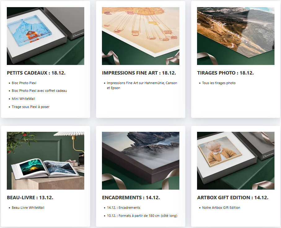 Pour garantir que vos cadeaux arrivent à temps pour le 24 décembre, nous vous recommandons de passer vos commandes dès que possible. Cela permet d’éviter tout retard de livraison et de vous assurer d’avoir la surprise parfaite pour les amateurs de photographie dans votre entourage.