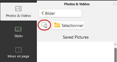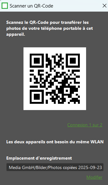Désormais, vous pouvez transférer vos photos dans le logiciel du Beau-Livre à l’aide d’un QR code. Vous trouverez cette fonction dans l’onglet « Photos & Vidéos ». Les photos sont enregistrées localement sur votre ordinateur, et vous pouvez choisir librement l’emplacement de stockage. Veuillez noter que votre ordinateur et votre smartphone doivent être connectés au même réseau Wi-Fi pour que le transfert fonctionne.