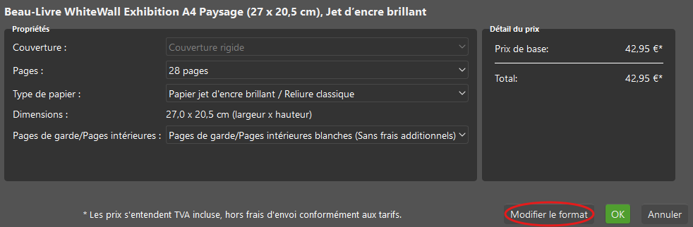 Beau-Livre (logiciel à télécharger) : Ici, un changement de format ultérieur n’est possible qu’entre Exhibition A4 paysage et Portfolio A3 paysage, ou entre Exhibition A4 portrait et Portfolio A3 portrait. Cliquez en bas à droite sur « Modifier les caractéristiques », puis sur « Modifier le format ».