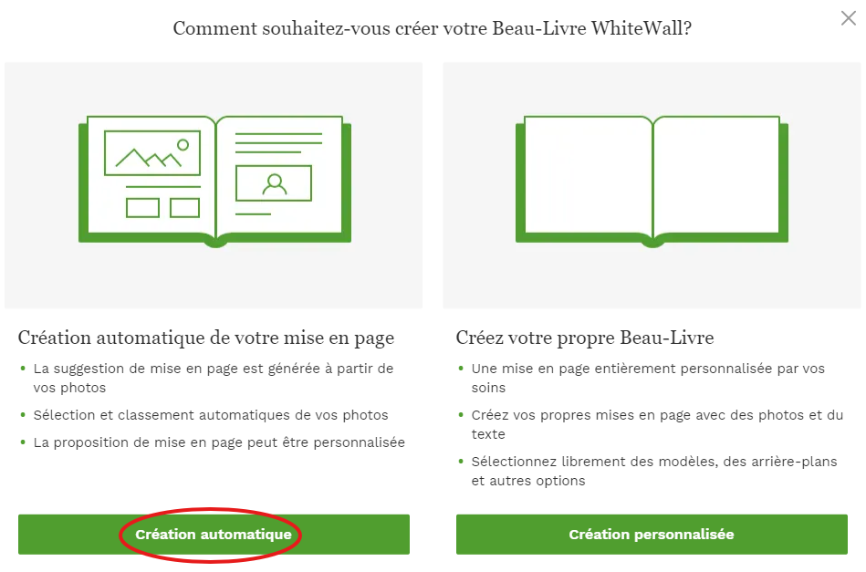 Pour créer votre Beau-Livre, un assistant propose une mise en page automatique avec vos photos. Cela est possible à la fois dans notre éditeur en ligne et dans le logiciel à télécharger. La proposition de mise en page automatique peut ensuite être personnalisée.
