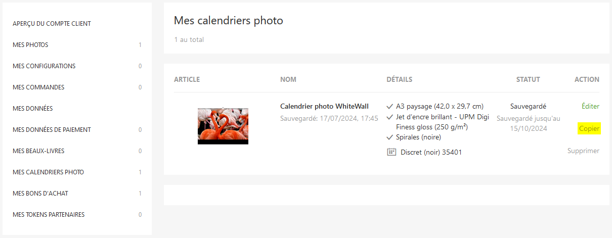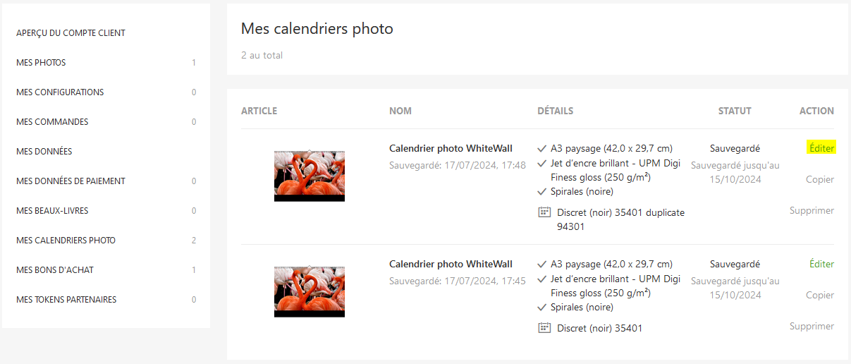 Un calendrier existant enregistré dans votre compte client sous « Mes calendriers photo » peut être dupliqué puis modifié afin de commander la version dupliquée dans une autre taille :