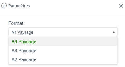 Dans l’éditeur, vous pouvez modifier la taille de votre calendrier via le bouton « Paramètres » situé à gauche. Vous verrez que seuls les formats dans l’orientation précédemment sélectionnée sont affichés :
