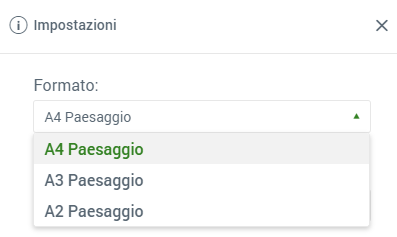 Nell’editor, è possibile modificare la dimensione tramite il pulsante "Impostazioni" sulla destra. Verranno mostrati solo i formati nella orientazione precedentemente selezionata: