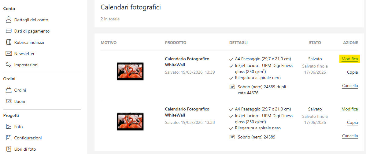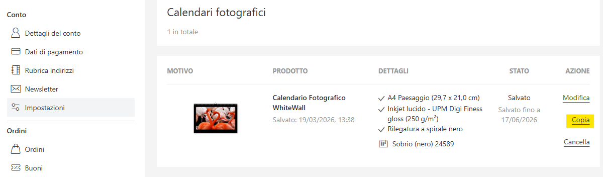 Un calendario esistente salvato nel vostro account cliente sotto “Calendari Fotografici” può essere duplicato e successivamente modificato, in modo da poter ordinare la versione duplicata in un’altra dimensione: